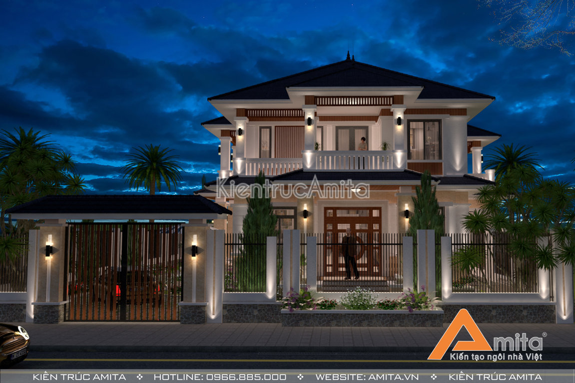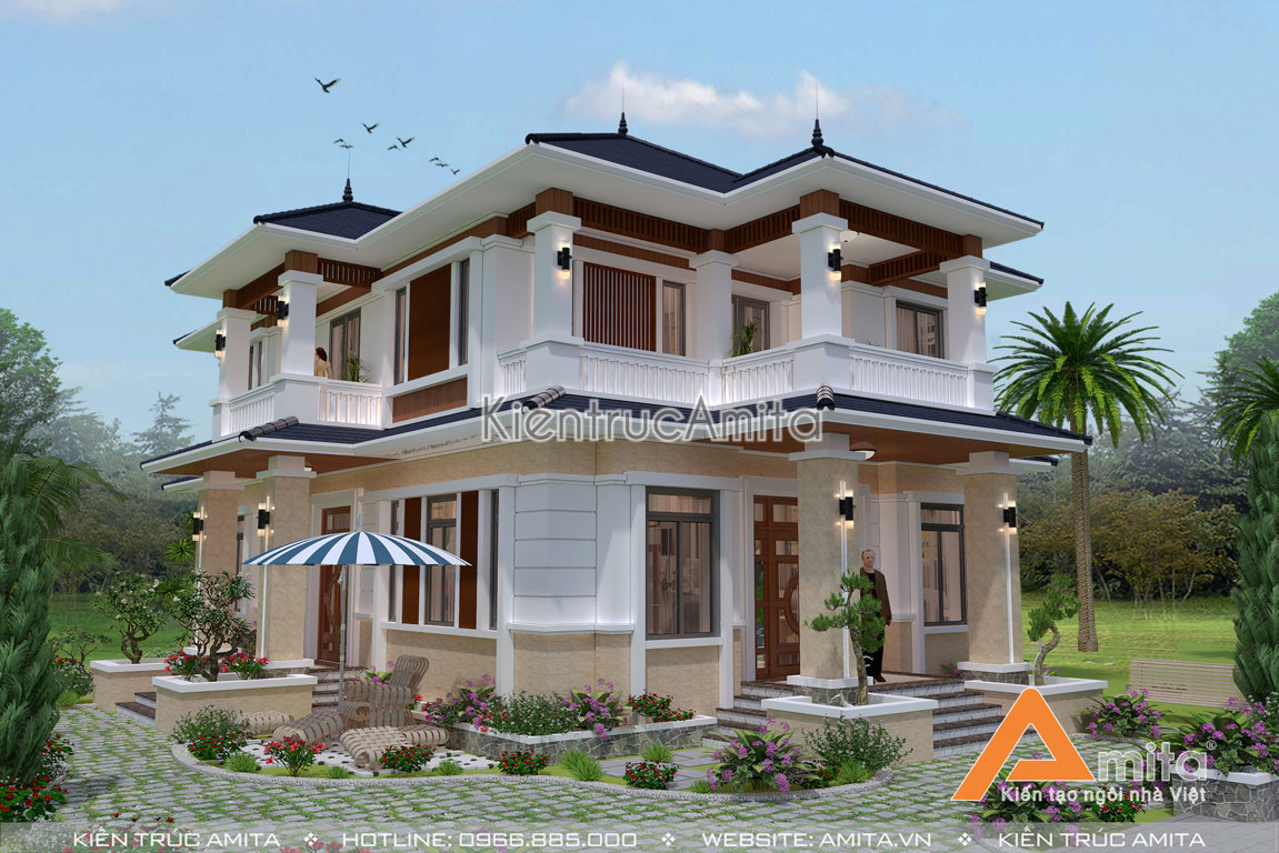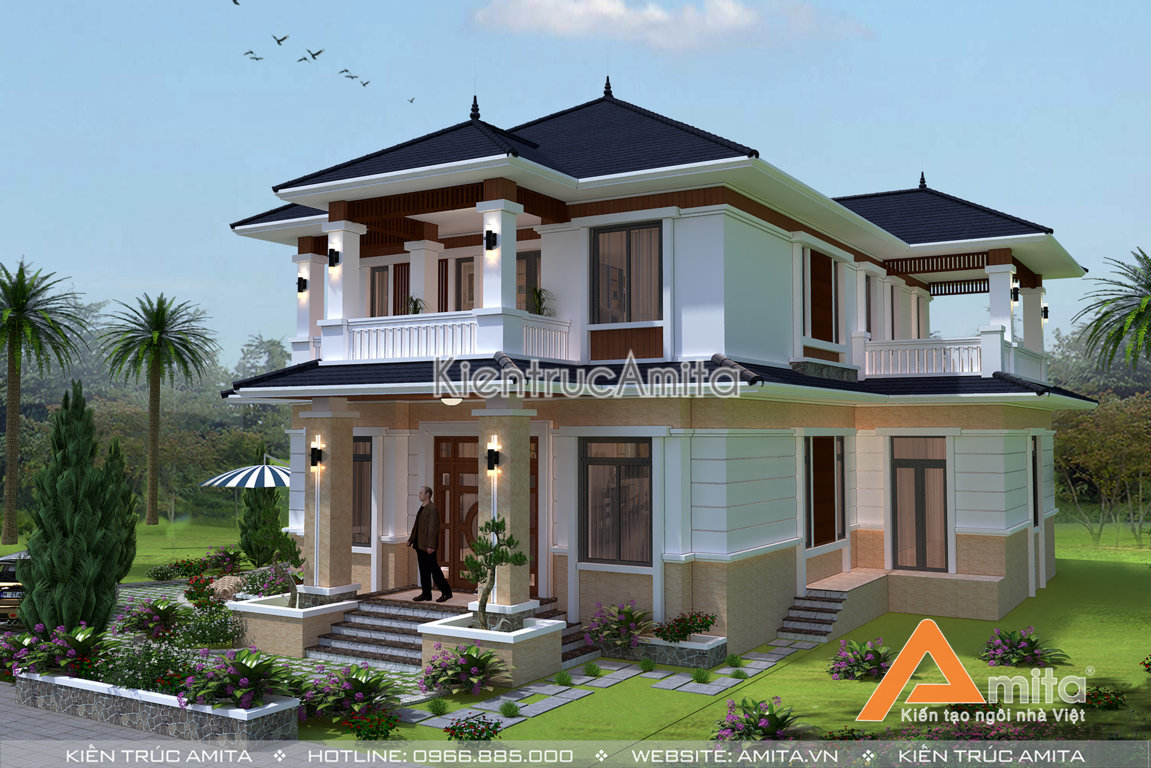 Đặc trưng của phong cách kiến trúc Thiết kế biệt thự 2 tầng hiện đại là không gian mở, hướng tới việc kết nối thiên nhiên với con người. Vì thế, các kiến trúc sư AMITA đã nghiên cứu kỹ lưỡng để phát huy thế mạnh của ngôn ngữ kiến trúc này bằng cách sử dụng hệ thống cửa kính lớn để cung cấp nguồn sánh sáng tự nhiên, không khí lưu thông tự nhiên, giúp bao quát cả căn nhà ngay từ bên trong. Ngoài ra, các kiến trúc sư còn kết hợp việc ốp đá tự nhiên bên ngoài tầng 1 để tạo hiệu ứng hút mắt, đồng thời làm cho căn biệt thự tươi sáng, mát mẻ hơn rất nhiều. Việc sử dụng kiến trúc mái Thái là rất phù hợp với điều kiện khí hậu nước ta, giúp điều hòa không khí, mát về mùa hè, tính thẩm mỹ rất thanh tao mang lại cảm giác thoải mái cho gia chủ cũng là sự lựa chọn vô cùng đúng đắn.