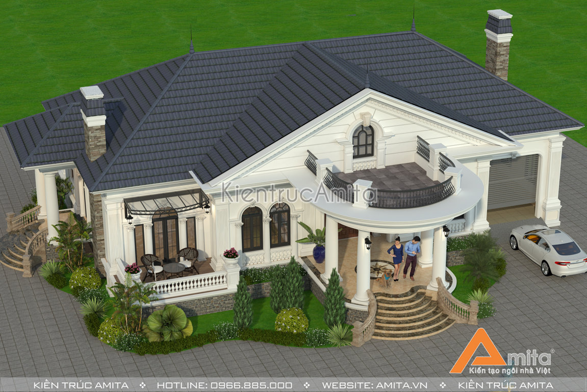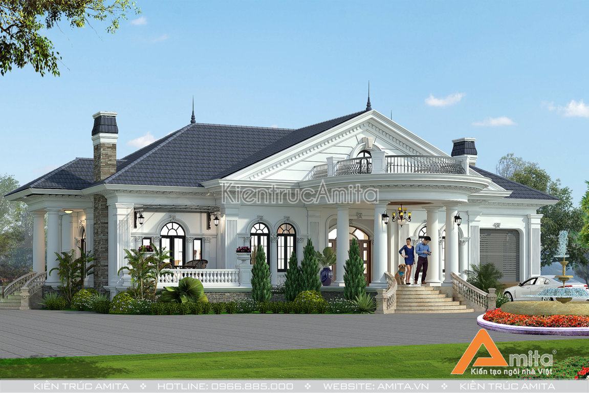 Mẫu thiết kế biệt thự dinh thự 1 tầng tân cổ điển sang trọng và tinh tế, khiến người xem không rời mắt. Thiết kế này tạo sự tiện nghi và không gian thoáng rộng cho người sử dụng, kết hợp với tiểu cảnh xung quanh làm cho ngôi biệt thự gần gũi với thiên nhiên, không gian dễ chịu, nhẹ nhàng. Hãy cùng chiêm ngưỡng mẫu biệt thự này dưới các khung hình được thiết kế bởi đội ngũ kiến trúc sư chuyên nghiệp của Amita