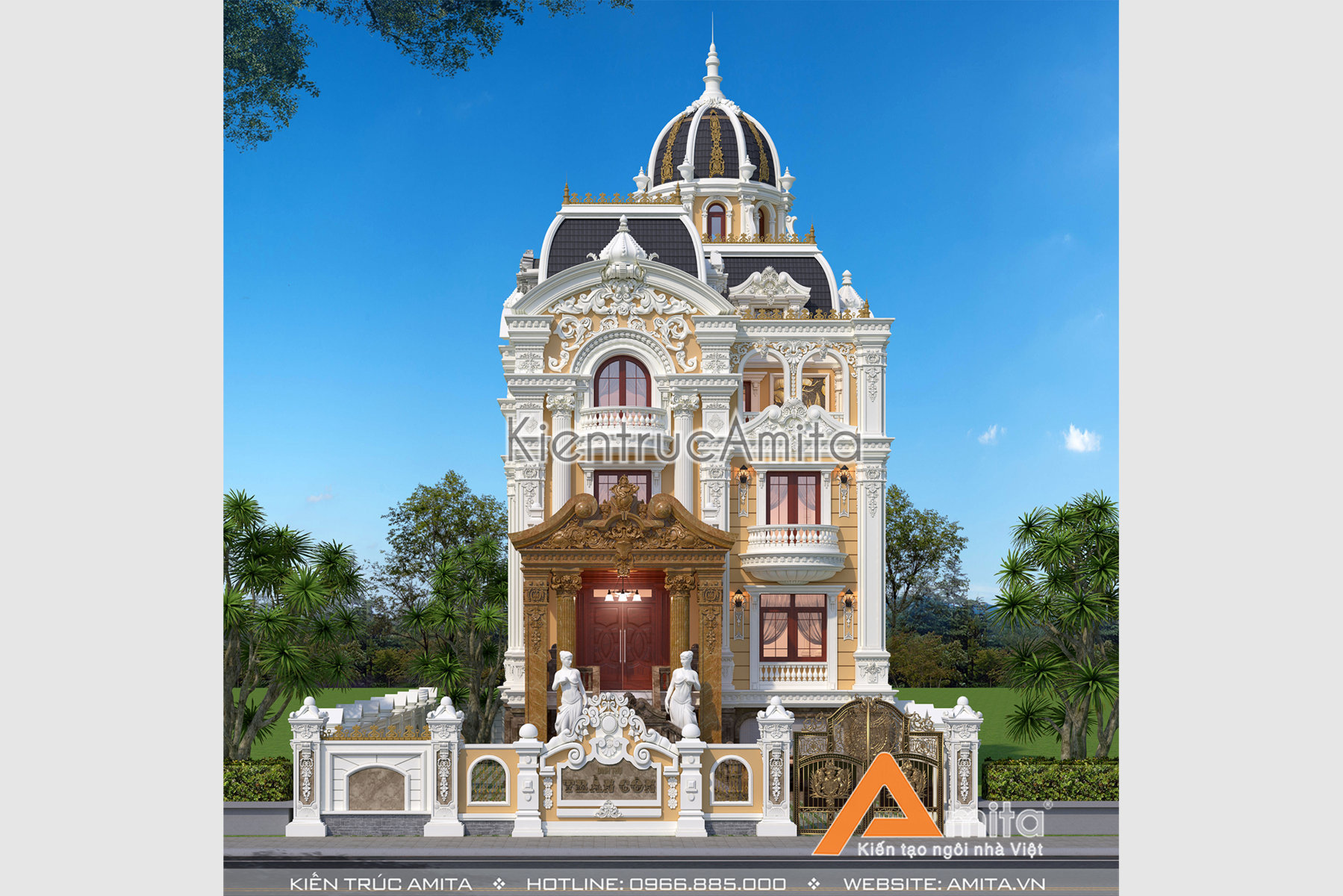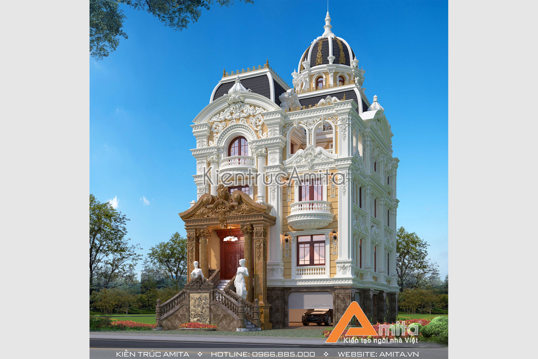 Được xây dựng trên một khu đất vuông vắn, rộng rãi có kích thước mặt tiền 10,1m và chiều sâu 15,9m, mẫu biệt thự lâu đài tân cổ điển 5 tầng hiện lên với vẻ đẹp nguy nga, tráng lệ. Nổi bật với những đường nét kiến trúc đắt giá, hệ thống trang trí, phào chỉ uốn lượn đậm chất nghệ thuật cùng cách sử dụng màu sắc đầy tinh tế, kết hợp với mái vòm và mái Mansard màu xanh vô cùng sang trọng, đẳng cấp. Ngoài ra, không gian bên trong cũng được đội ngũ kiến trúc sư Amita thiết kế nội thất theo phong cách tân cổ điển để ngôi nhà có sự đồng nhất, mang đến niềm kiêu hãnh cho gia đình chu đầu tư.