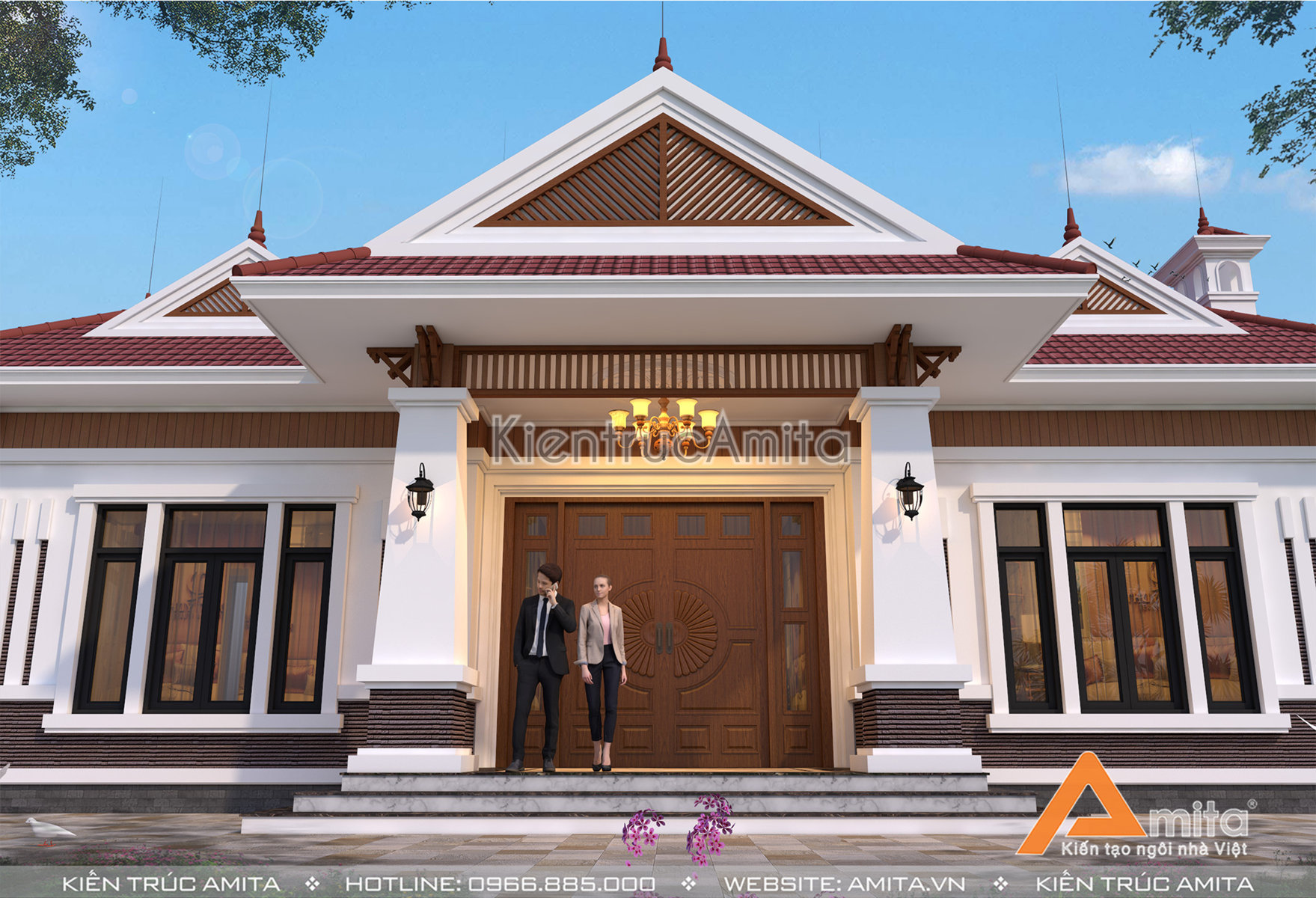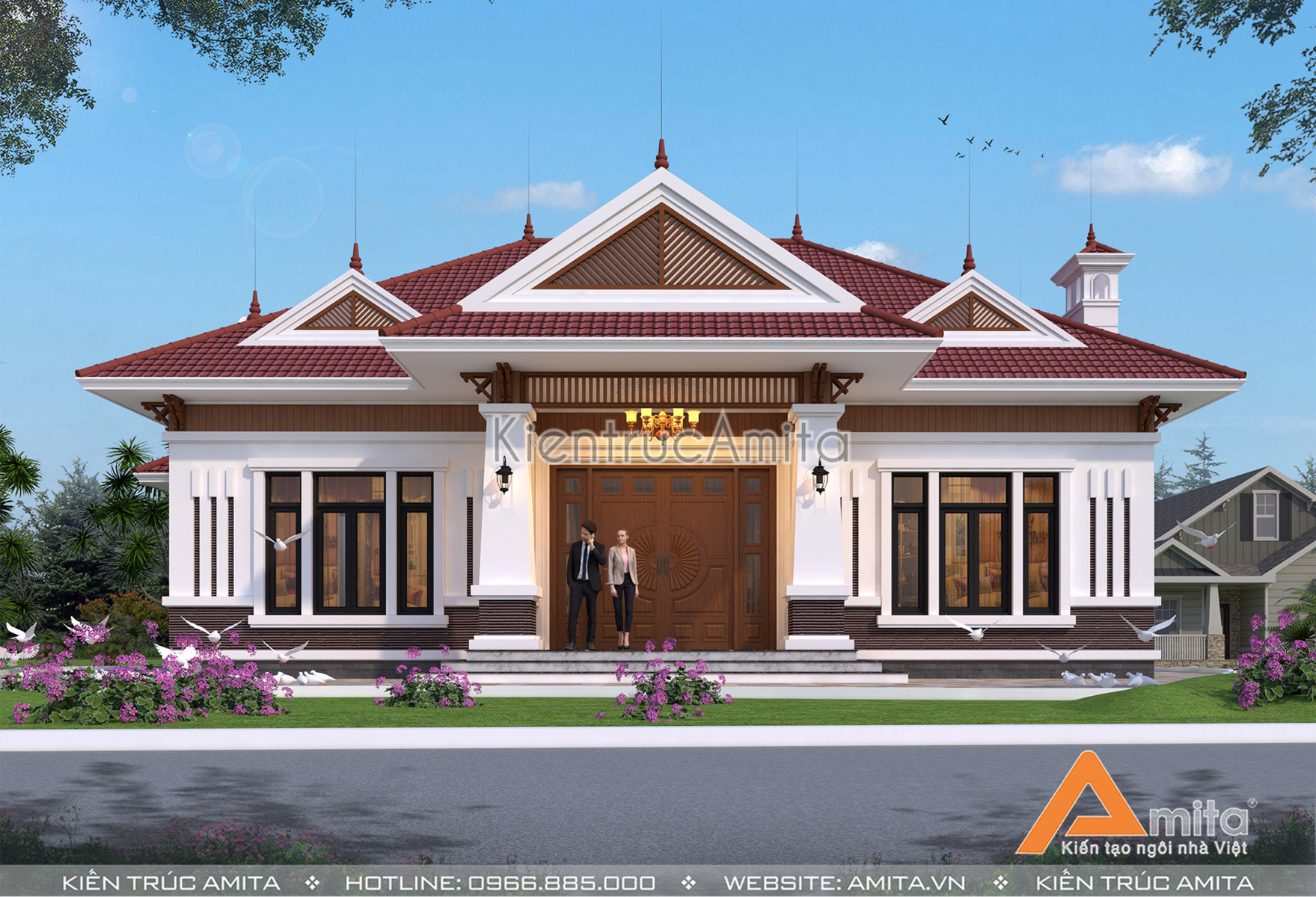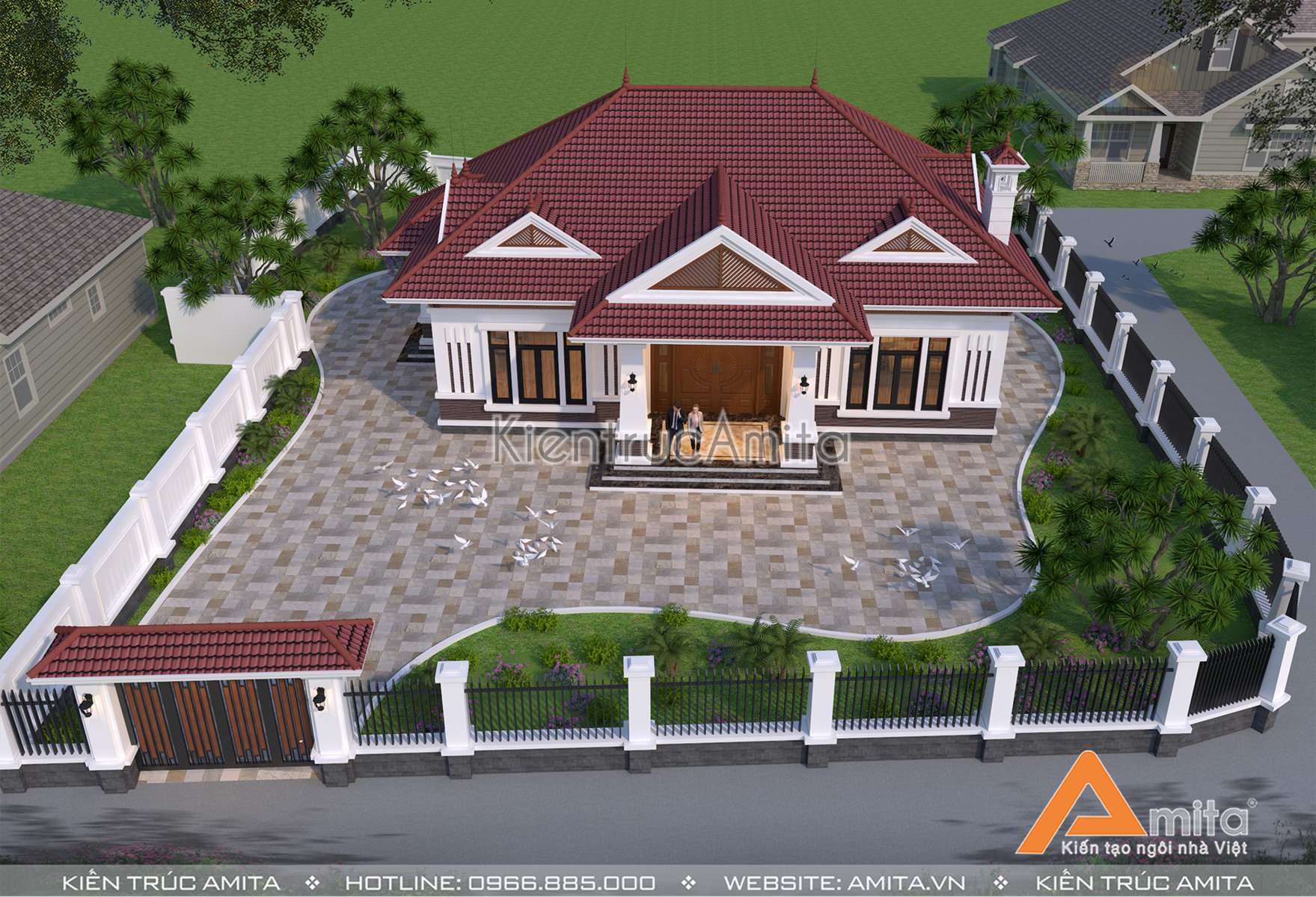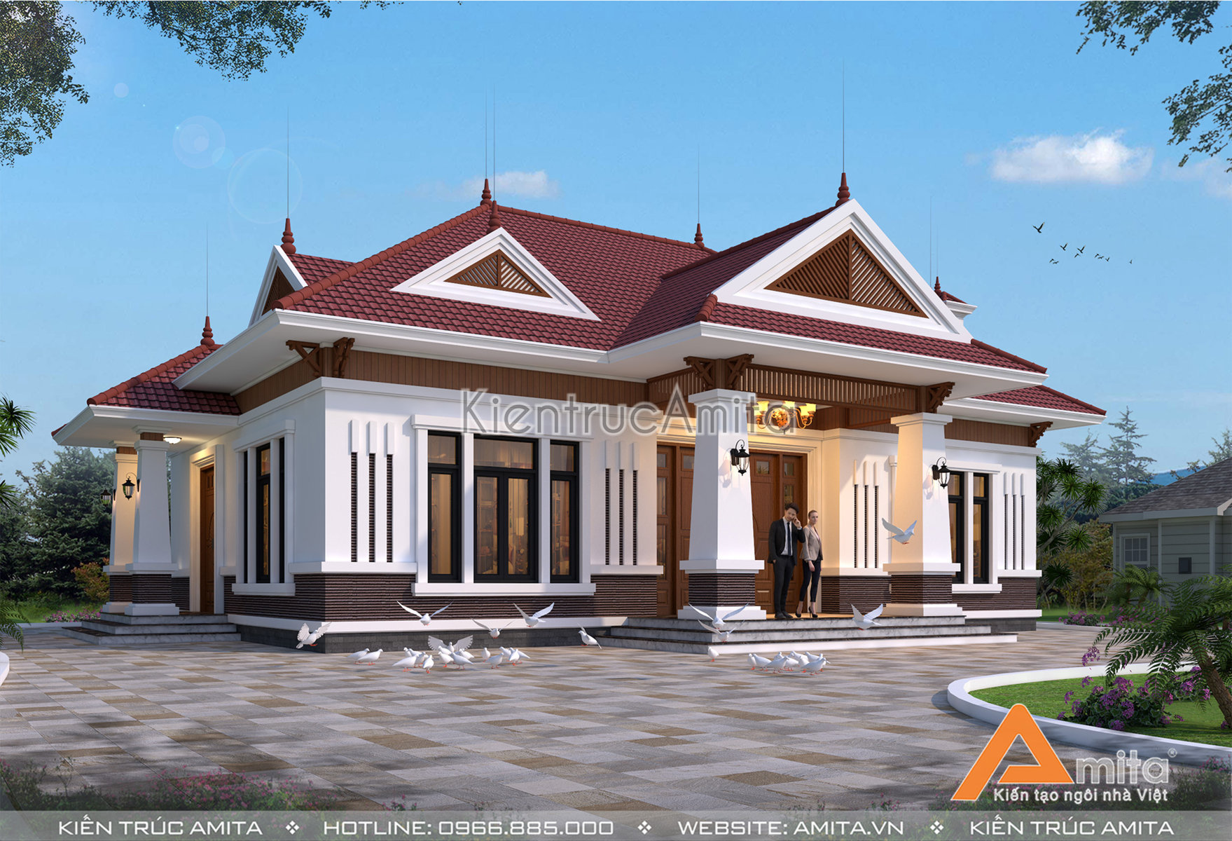 Mái thái được ưa chuộng từ rất lâu về trước, đặc biệt là tại các khu vực nông thôn thì kiểu kiến trúc này càng dễ dàng bắt gặp hơn nữa. Đối với mẫu thiết kế biệt thự 1 tầng này, Amita cách điệu mái thái Được thiết kế đua ra bên ngoài so với phần thân của ngôi nhà