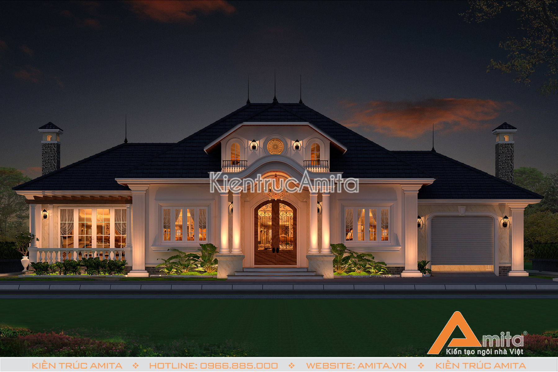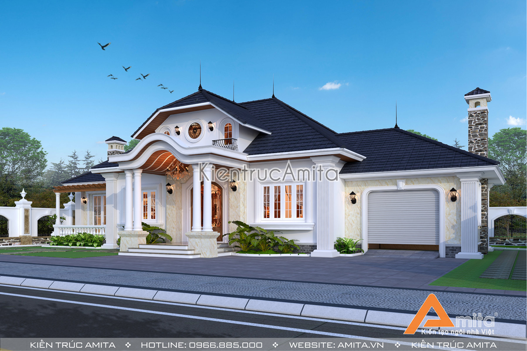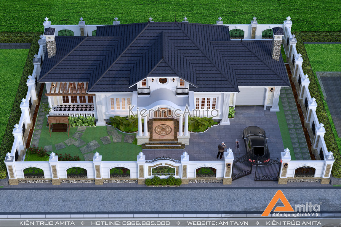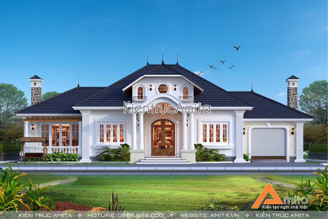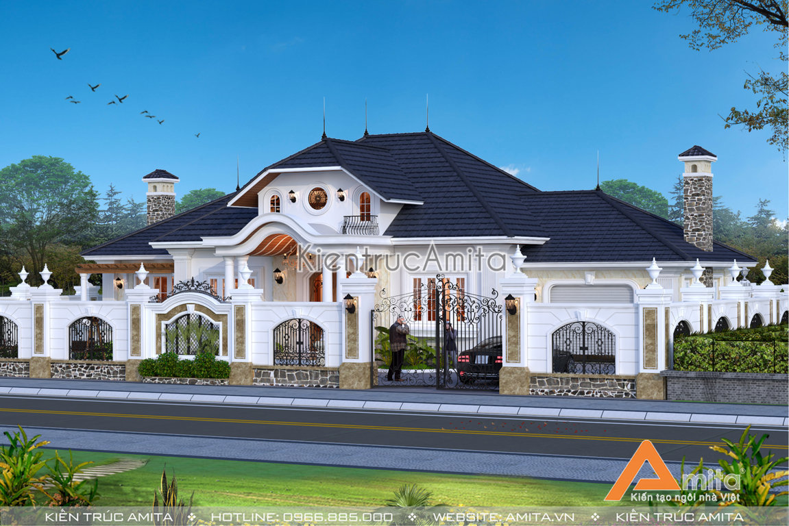 Cùng chiêm ngưỡng mẫu thiết kế dinh thự 1 tầng phong cách tân cổ điển để thấy nét đẹp đẳng cấp mà kiến trúc Amita đem lại. Thiết kế đáp ứng được toàn bộ mong muốn về thẩm mỹ cùng công năng thích hợp với nhu cầu sinh hoạt của từng thành viên trong gia đình bà Lan. Hơn nữa, việc tối giản các chi tiết hoa văn khiến cho mặt tiền trở nên vô cùng thông thoáng và tiết kiệm được một phần chi phí xây dựng không nhỏ.
