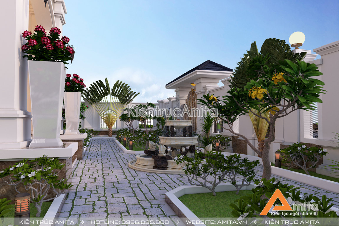 Phối cảnh một góc sân vườn đẹp, sinh động của công trình biệt thự 2 tầng tân cổ điển mái Thái