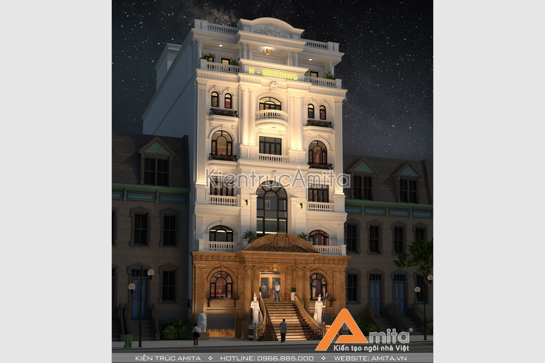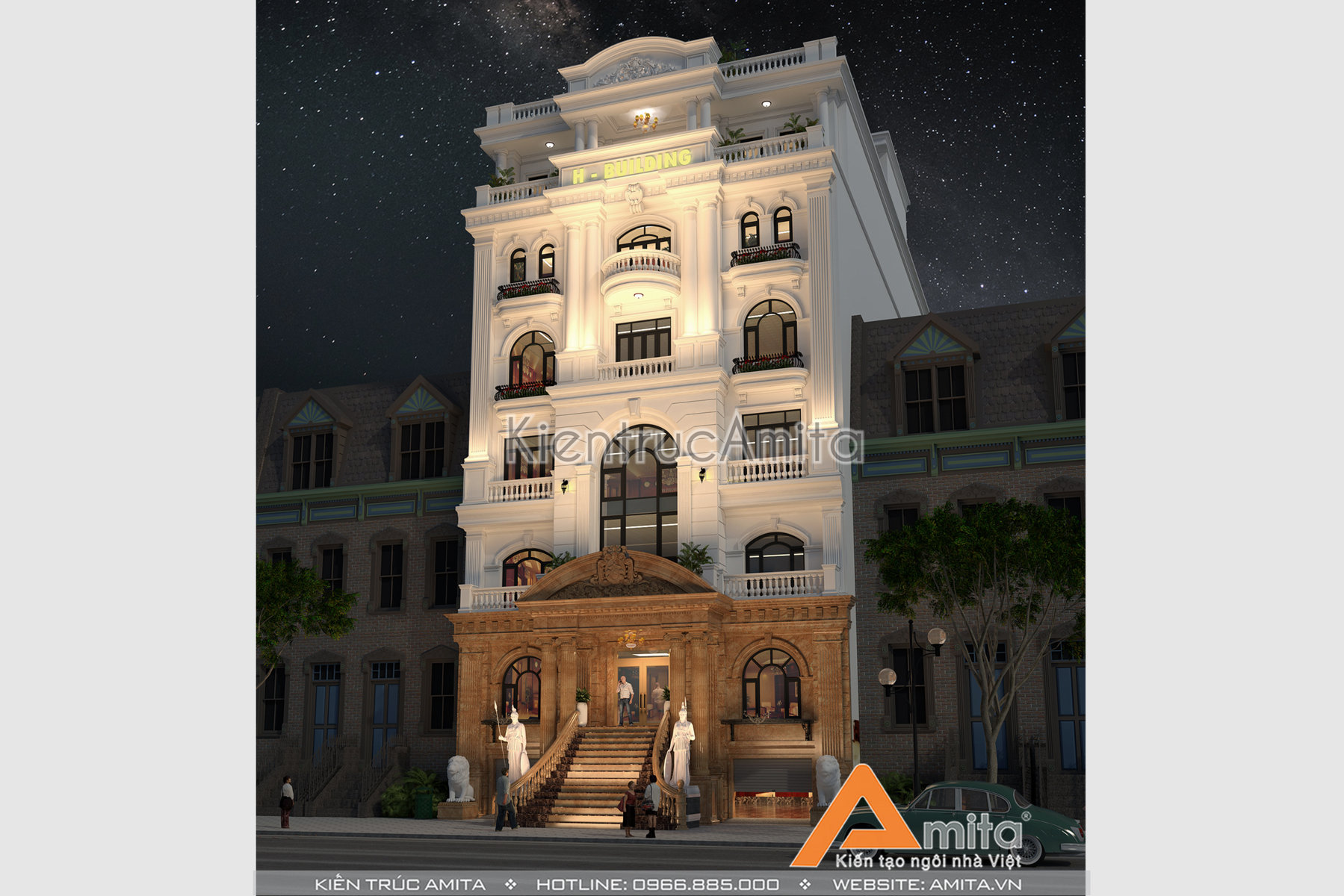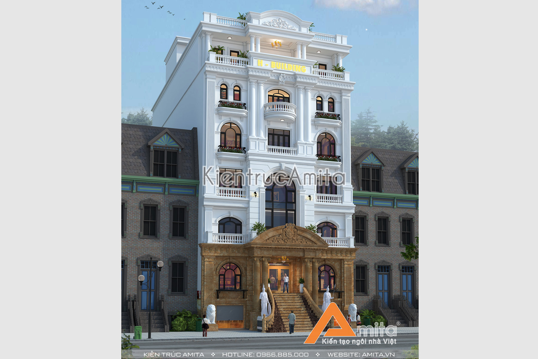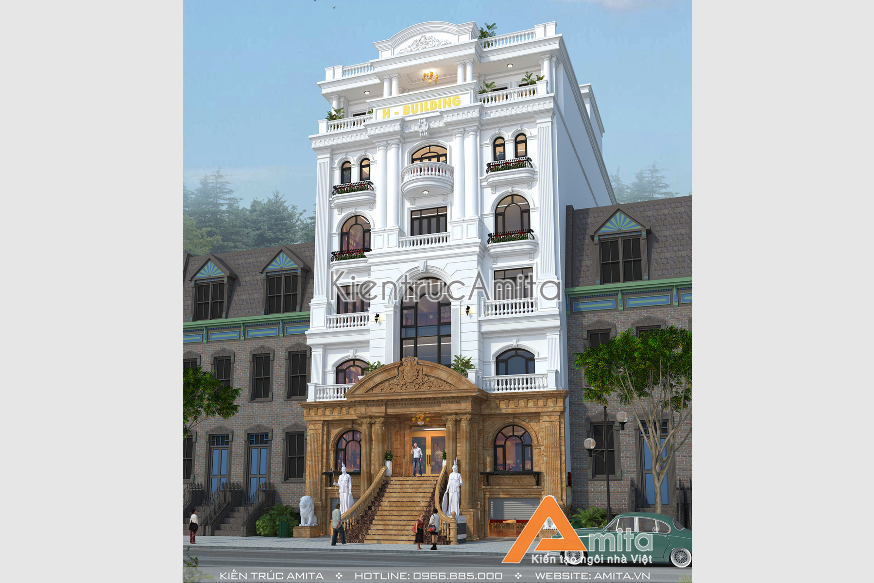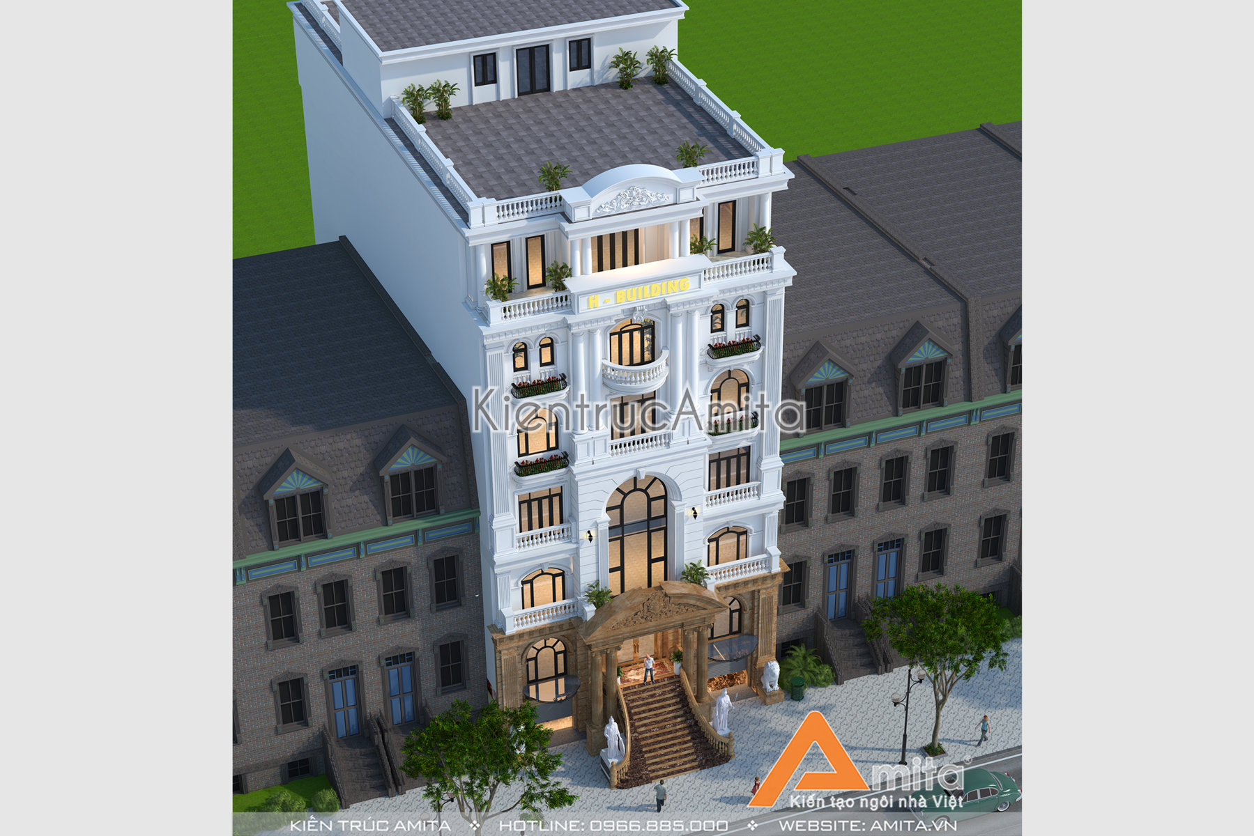 Mẫu thiết kế nhà văn phòng tân cổ điển đẹp của CĐT ông Phúc tại Bình Dương đẹp ấn tượng từ cái nhìn đầu tiên. Thiết kế theo phong cách tân cổ điển giúp cho tòa nhà văn phòng vừa mang vẻ cổ kính, vừa sang trọng hiện đại. Hãy liên hệ với kiến trúc Amita để được tư vấn chi tiết, chúng tôi luôn mong muốn được phục vụ quý khách hàng. Hotline 0966.885.000