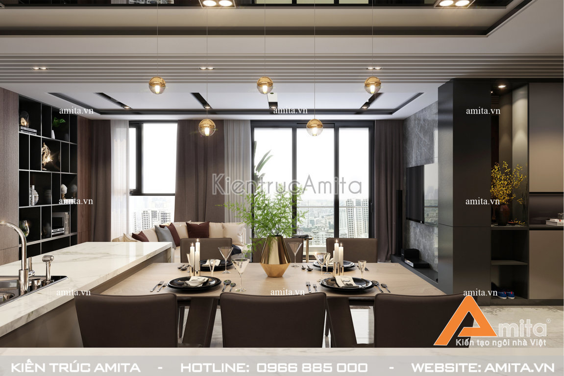 Khu vực bếp và phòng ăn của thiết kế nội thất chung cư hiện đại nhà bà Mai được thiết kế khoa học, hiện đại và đầy đủ mọi tiện nghi là mảnh ghép tạo nên bức tranh xuyên suốt từ phòng khách nhìn sang bếp và phòng ăn của thiết kế. Đây là không gian sinh hoạt chung của cả gia đình, chính vì vậy các kiến trúc sư Amita đã cố gắng đưa vào các sản phẩm nội thất thân thiện, đồ décor tinh tế tạo cảm giác gần gũi và gắn kết các thành viên. Vẫn là tông màu trầm sang trọng chủ đạo, khu phòng ăn với cách bày trí các dụng cụ, đèn trang trí... không khác gì ở nhà hàng thì chắc hẳn sau một ngày làm việc vất vả ai cũng muốn được về đoàn tụ với bữa cơm gia đình.