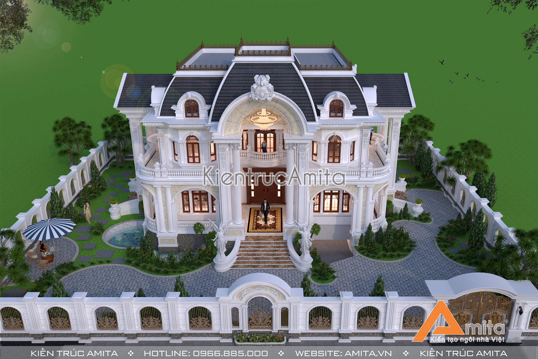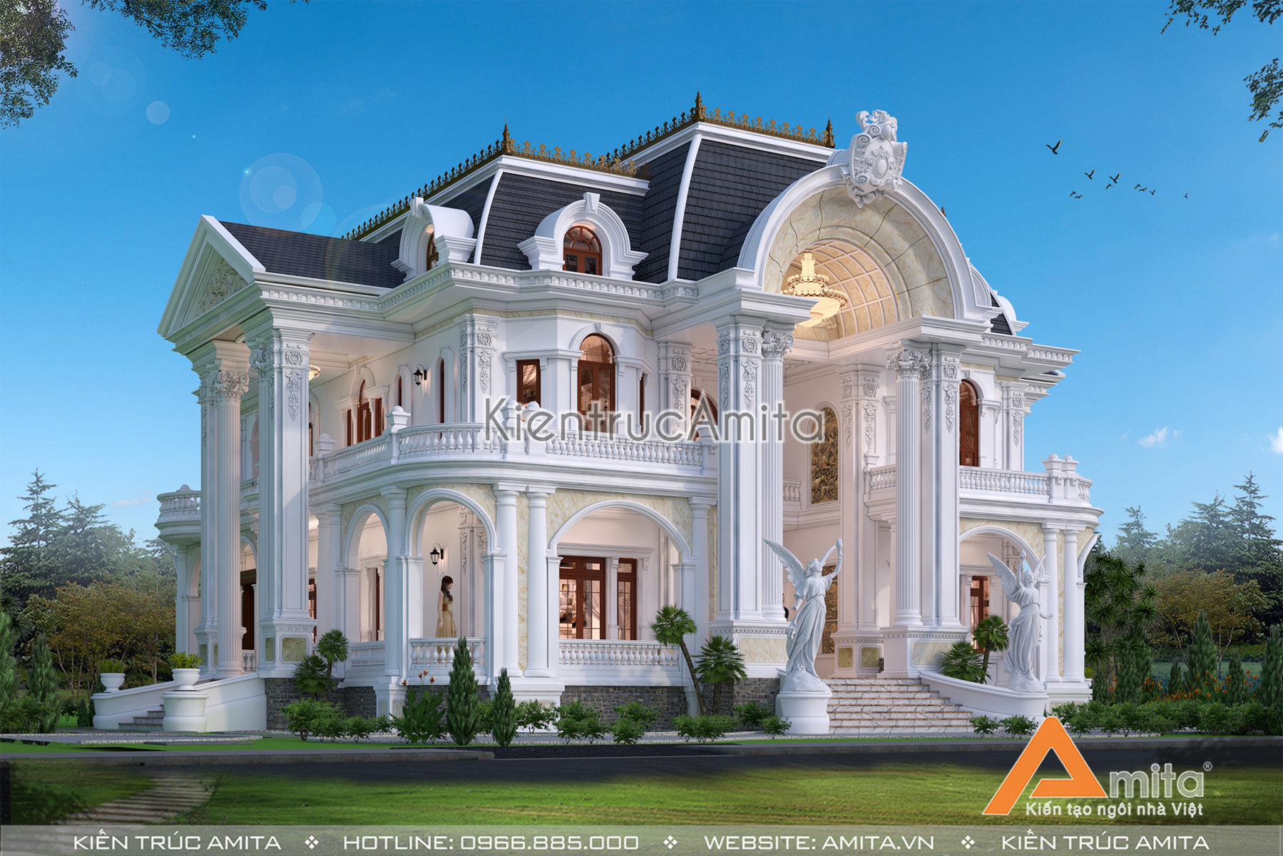 Kiến trúc Amita chuyên thiết kế và thi công biệt thự trên toàn quốc. Nếu như bạn thích mẫu thiết kế dinh thự 2 tầng tân cổ điển và mong muốn sở hữu một căn nhà ở cao cấp sang trọng, tiện nghi thì hãy liên hệ ngay với chúng tôi để được phục vụ tận tình, chu đáo. Amita: Uy tín từ chất lượng - Ấn tượng từ thiết kế