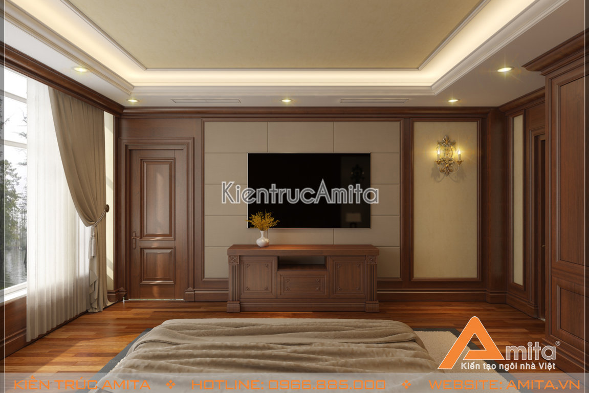 Phòng ngủ của nội thất biệt thự phong cách tân cổ điển lại được thiết kế khá đơn giản, sử dụng sự tối giản trong trang trí khi lược bỏ những chi tiết quá cầu kỳ, chỉ giữ lại giá trị cốt lõi và cân bằng chúng sao cho tổng thể ăn nhập, mang đến sự riêng tư và ấm cúng. Phòng ngủ có diện tích rộng rãi, thoáng đãng. Dưới chiếc giường bằng gỗ được đặt một tấm thảm trang trí, tường có ốp gạch rất tỉ mỉ, xung quanh được lắp đặt thêm một chút đèn có cường độ ánh sáng nhẹ, vừa phải. Thoạt nhìn là muốn nằm ngay lên chiếc giường êm ái ấy, để mơ những giấc mơ thật đẹp ^-^. Căn phòng còn được thiết kế vị trí để tủ đồ, bộ bàn trang điểm cũng như chiếc bàn được đặt ngay ngắn trước chiếc tivi màn hình phẳng thật đẹp, thật cân xứng. Mọi thứ đều được đo đạc hết sức chuẩn xác để tất đều vừa vặn, không thừa cũng không thiếu để không gian thật sự cân bằng.
