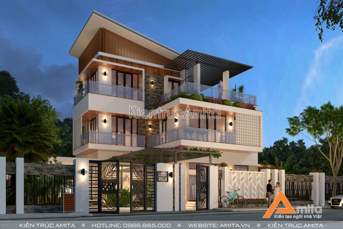 Thiết kế biệt thự hiện đại 3 tầng mái chéo được các kiến trúc sư Amita lấy cảm hứng từ các khối hình lập thể, đa chiều và khá nhiều góc cạnh trong toán học không gian. Cùng với đó là các đường nét trang trí tạo hình mới lạ, ngôi nhà là tổ hợp của sự đa dạng những đường thẳng vuông vắn, chắc khỏe với nhiều kích thước và chiều dài khác nhau. Thiết kế sử dụng các gam màu đơn sắc: trắng, đen, nâu càng làm cho tổng thể công trình thể hiện rõ nét sự phóng khoáng, hiện đại đầy nổi bật đã tạo nên một cảm giác đặc biệt với những người đang ngắm nhìn nó. Đó là sự choáng ngợp trước vẻ đẹp thời thượng trong kiến trúc hiện đại mà kiến trúc Amita đã khéo léo tạo ra.