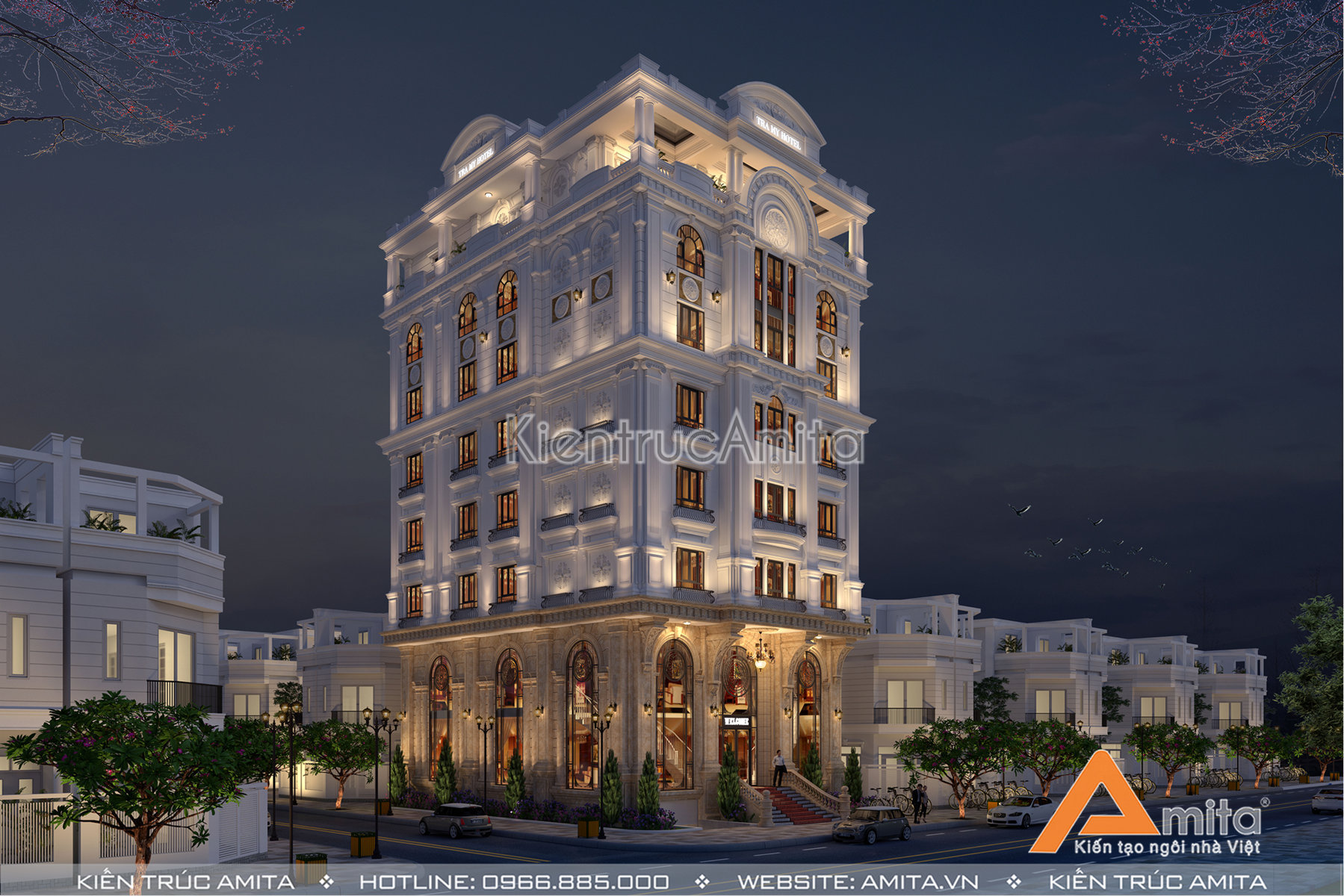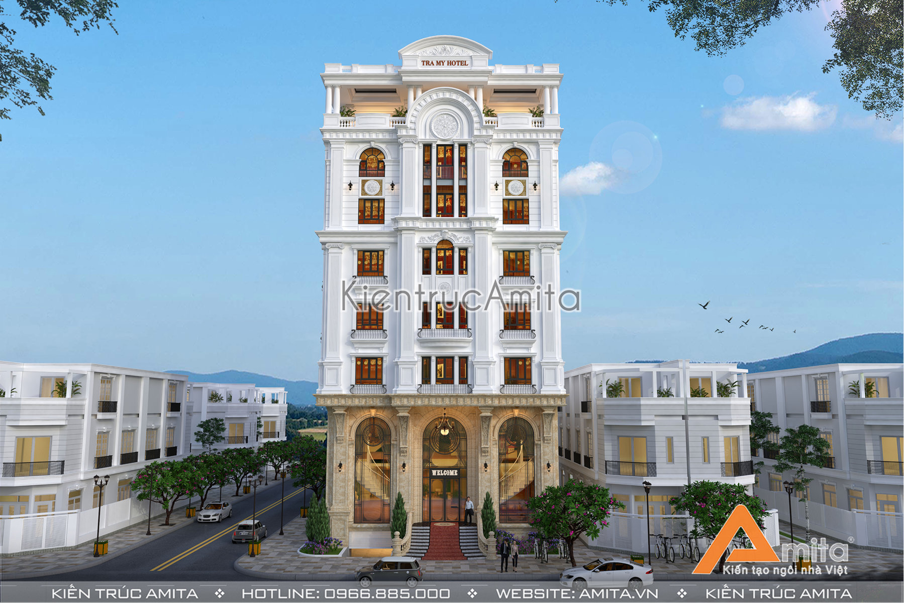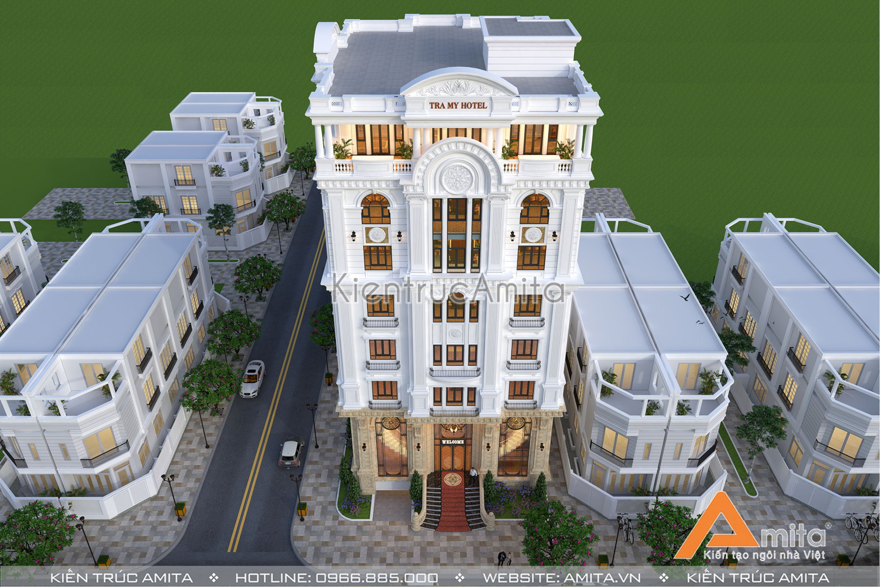 Với đội ngũ kiến trúc sư giàu kinh nghiệm từ nhiều trường đại học nổi tiếng, chúng tôi tự tin đem lại sự hài lòng cho mọi gia chủ. Nếu như bạn thích mẫu thiết kế khách sạn kiểu Pháp đẹp đẳng cấp như thế này thì hãy liên hệ với kiến trúc Amita để được tư vấn miễn phí và cụ thể: