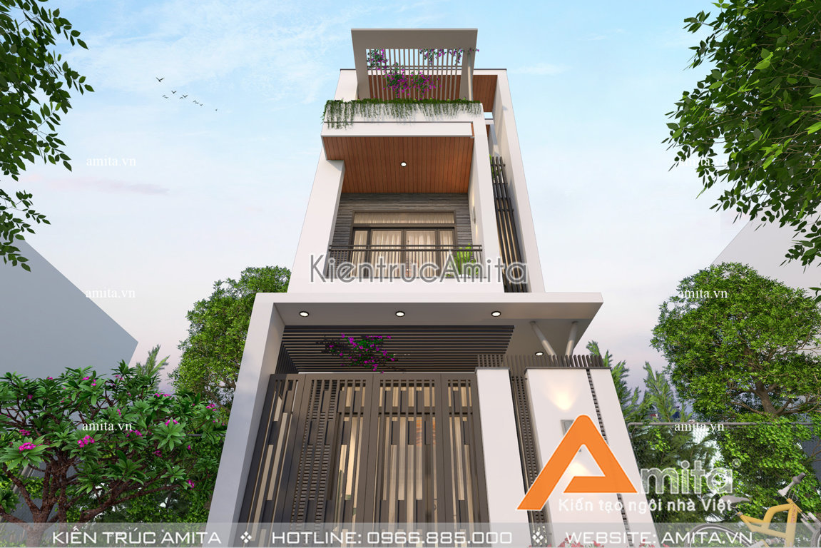 Ngoài ra mẫu thiết kế nhà ống hiện đại 3 tầng còn có những điểm gây chú ý như phần mái che kết hợp làm giàn hoa ở tầng 1, các KTS Amita đã tính toán ngay giải pháp che nắng che mưa trước khi bước vào nhà lại tạo ra được một khoảng không gian nhỏ có thể trang trí gian hoa hay cây cảnh khu vực này, thêm một giàn hoa nữa được bố trí ở tầng 3 phía trên khu vực ban công sân phơi đã tối ưu được toàn bộ không gian lại tăng thêm phần tươi mát cho ngôi nhà.