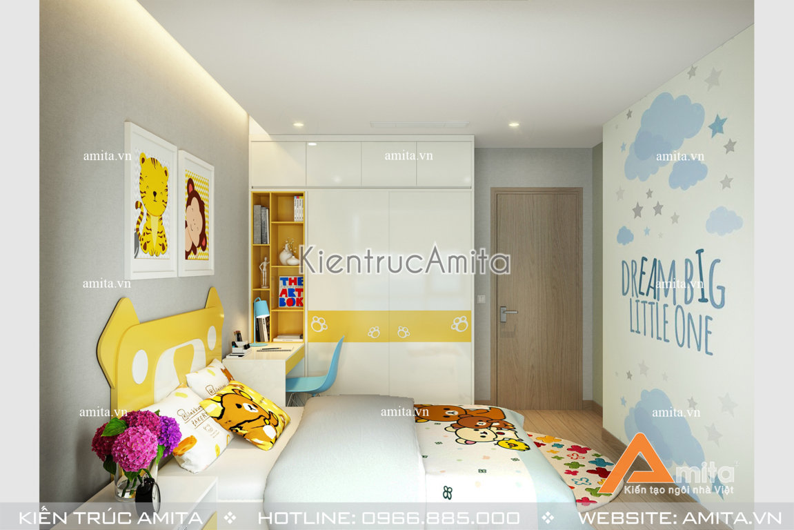 Phòng ngủ của em bé được thiết kế khá bắt mắt với màu vàng nổi bật giữa tông màu trắng. Những bức tranh ngộ nghĩnh và tủ đựng quần áo cũng được bố trí gần nơi bé ngủ. Ngoài ra bức tường được trang trí họa tiết bắt mắt cùng dòng chữ xinh xắn "Dream Big Little One" thật đáng yêu phải không nào? Mọi thứ đều được điểm tô những màu sắc tươi mới, ngộ nghĩnh, kết hợp với những họa tiết hình ảnh con vật, nhân vật hoạt hình gần gũi với trẻ thơ đã tạo nên một thế giới riêng cho các bé. Đặc biệt chú ý đến đầu giường ngủ tạo hình chú chó đáng yêu màu vàng.