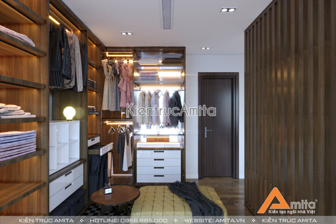 Thiết kế sang trọng và đẳng cấp của không gian phòng ngủ không thể thiếu đi khu vực để đồ và thay đồ riêng. Phần lớn khu vực này được thiết kế tủ quần áo nhiều ngăn được tính toán khoa học và hợp lý, khoảng không gian bên ngoài gần ban công được tận dụng để bài trí một số mãy tập thể dục cá nhân, khu vực này vừa có ánh sáng lại không bị ảnh hưởng bởi các yếu tố khác từ bên ngoài giúp cho những giờ thể dục của mỗi thành viên sẽ hiệu quả hơn.