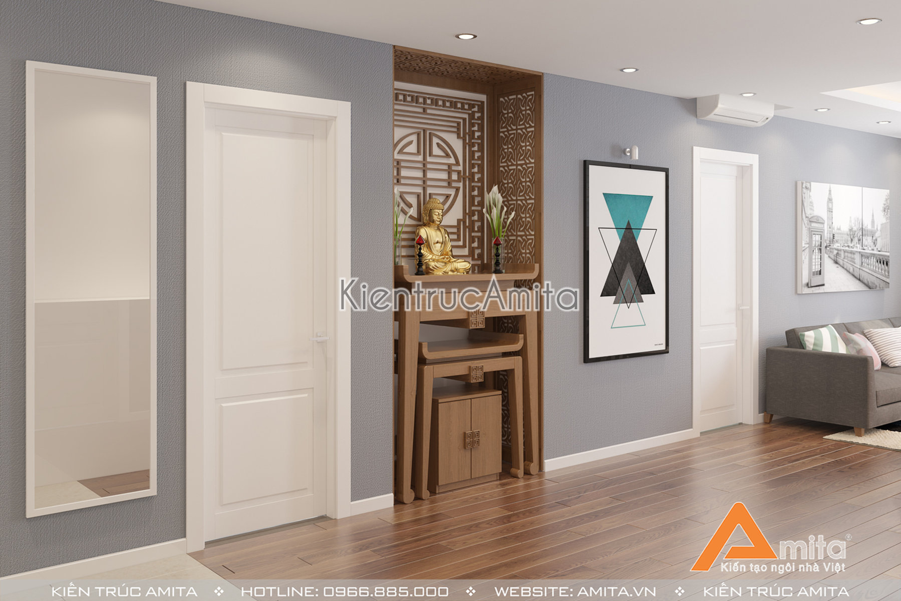Ngoài ra yếu tố tâm linh ở Việt Nam cũng rất được quan tâm chính vì vậy các KTS Amita đã kết hợp yếu tố phong thủy vào trong việc bố trí khu vực thờ Phật của gia đình ông Dương cho phù hợp. Khu vực này không quá lộ ra ngoài và đặt ở vị trí trang trọng của không gian chính trong thiết kế nội thất chung cư đẹp sang trọng.