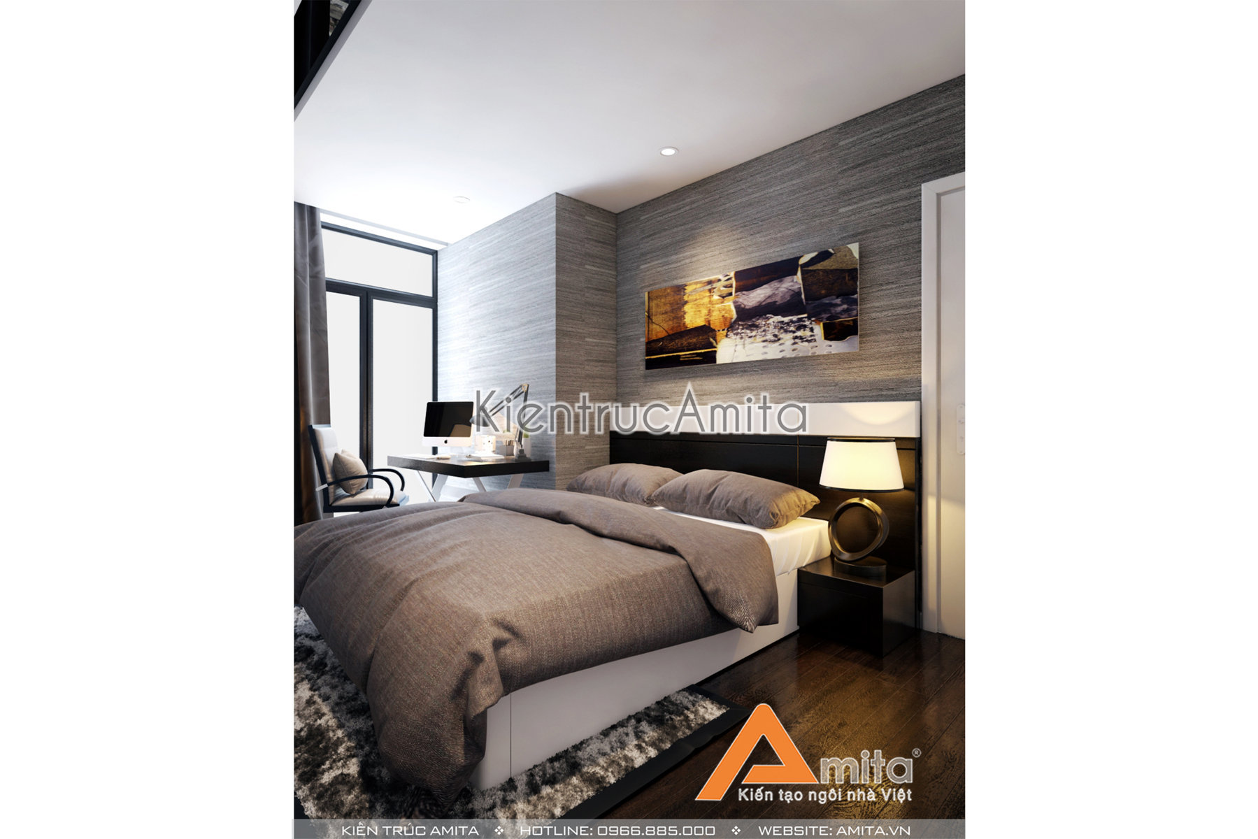Một không gian tuyệt vời nữa của thiết kế chung cư hiện đại mà các KTS Amita đã mang đến cho gia đình ông Hồng đó chính là phòng ngủ, có lẽ sau một ngày làm việc bên ngoài thì một không gian nghỉ ngơi lại là quan trọng nhất. Với diện tích hạn chế hai phòng ngủ của gia đình được thiết kế hiện đại, ấm cúng mà không kém phần sang trọng. Vẫn với hai gam màu chính là ghi và trắng tạo cảm giác nhẹ nhàng, dễ chịu. Giường ngủ, bàn làm việc, ti vi... mọi thứ được sắp xếp gọn gàng, vừa vặn và khoa học.