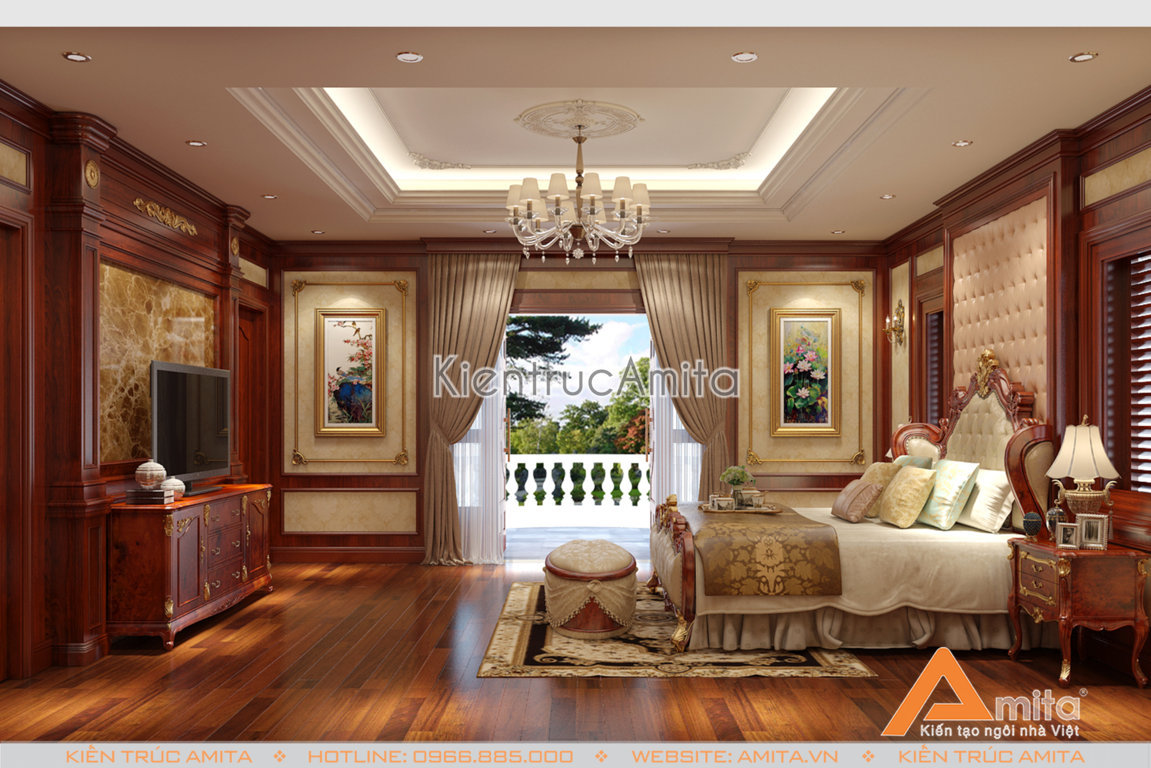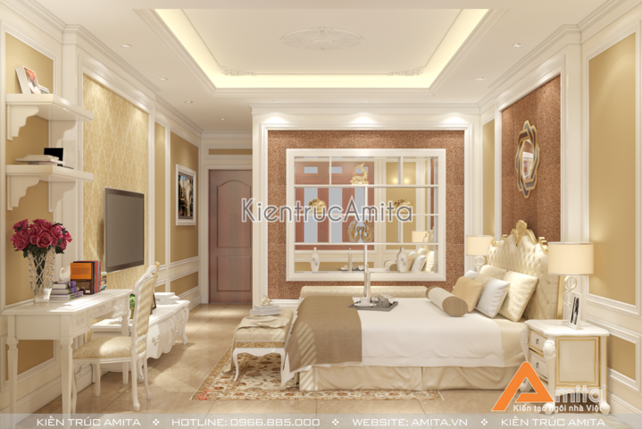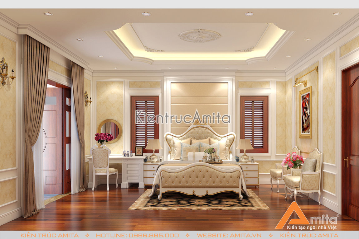 Các kiến trúc sư Amita đã chăm chút từng chi tiết của Phòng Ngủ Master, từ chiếc đèn chùm nhẹ nhàng lãng mạn, tone sur tone với bộ rèm cửa 2 lớp cầu kỳ, đến những chiếc ghế nghỉ được đặt để khéo léo, tạo nên một không gian sống ấm cũng, nhưng cũng không kém phần xa hoa, đẳng cấp. Đây cũng chính là điểm mạnh của Phong cách Thiết kế nội thất tân cổ điển mang lại.