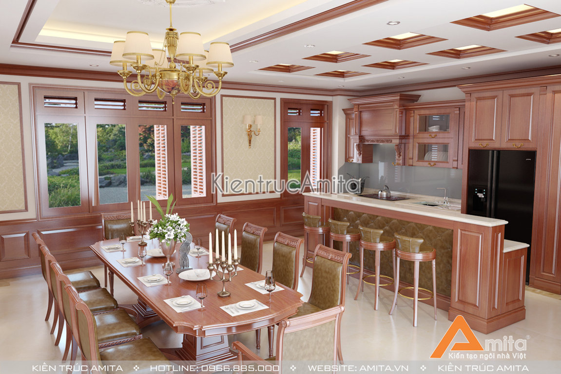 Phòng bếp phong cách Tân Cổ Điển của căn Biệt Thự được bố trí thoáng rộng với Bộ Bàn Ăn lớn và sang trọng. Hệ Thống tủ bếp và quầy Bar được tiết chế tối giản cho gia chủ, tạo không gian thoải mái, sạch sẽ cho căn bếp.