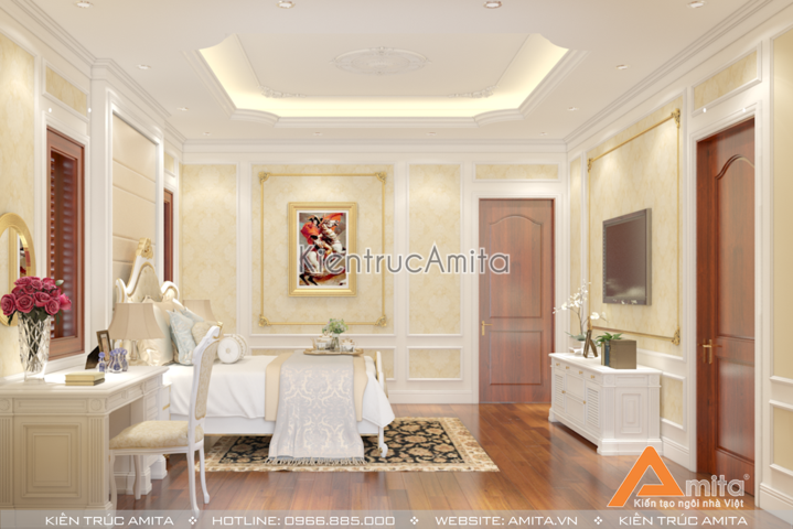 Gam màu vàng trắng lại được sử dụng cho phòng ngủ khác của căn biệt thự. Cũng là một trong những tone màu chủ đạo của Nội thất phong cách tân cổ điển, gam màu sáng lại mang đến sự trẻ trung và cảm giác rộng rãi cho không gian phòng ngủ diện tích hạn chế.